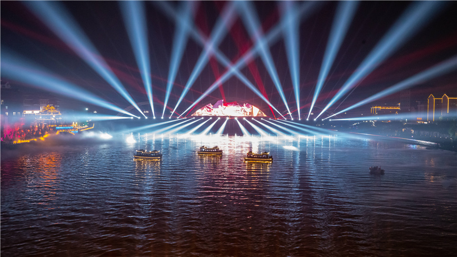 暮色四合,芷江和平湖上船影搖曳。兩岸燈火如星子傾落,水幕彩橋、巨幅光影、影像長廊次第綻放,龍津風(fēng)雨橋、天后宮、萬和鼓樓、索子街吊腳樓群等建筑仿佛披上流光霓裳,在夜色中煥發(fā)別樣神采。