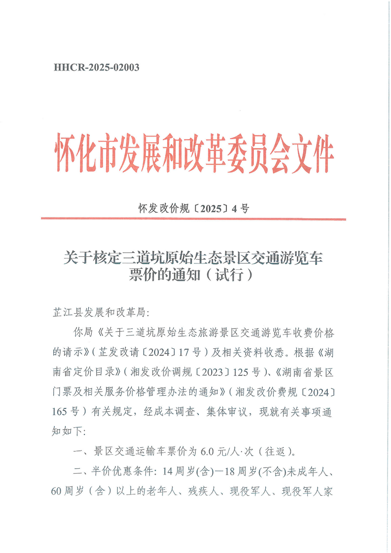 關(guān)于核定三道坑原始生態(tài)景區(qū)交通游覽車票價的通知(試行)